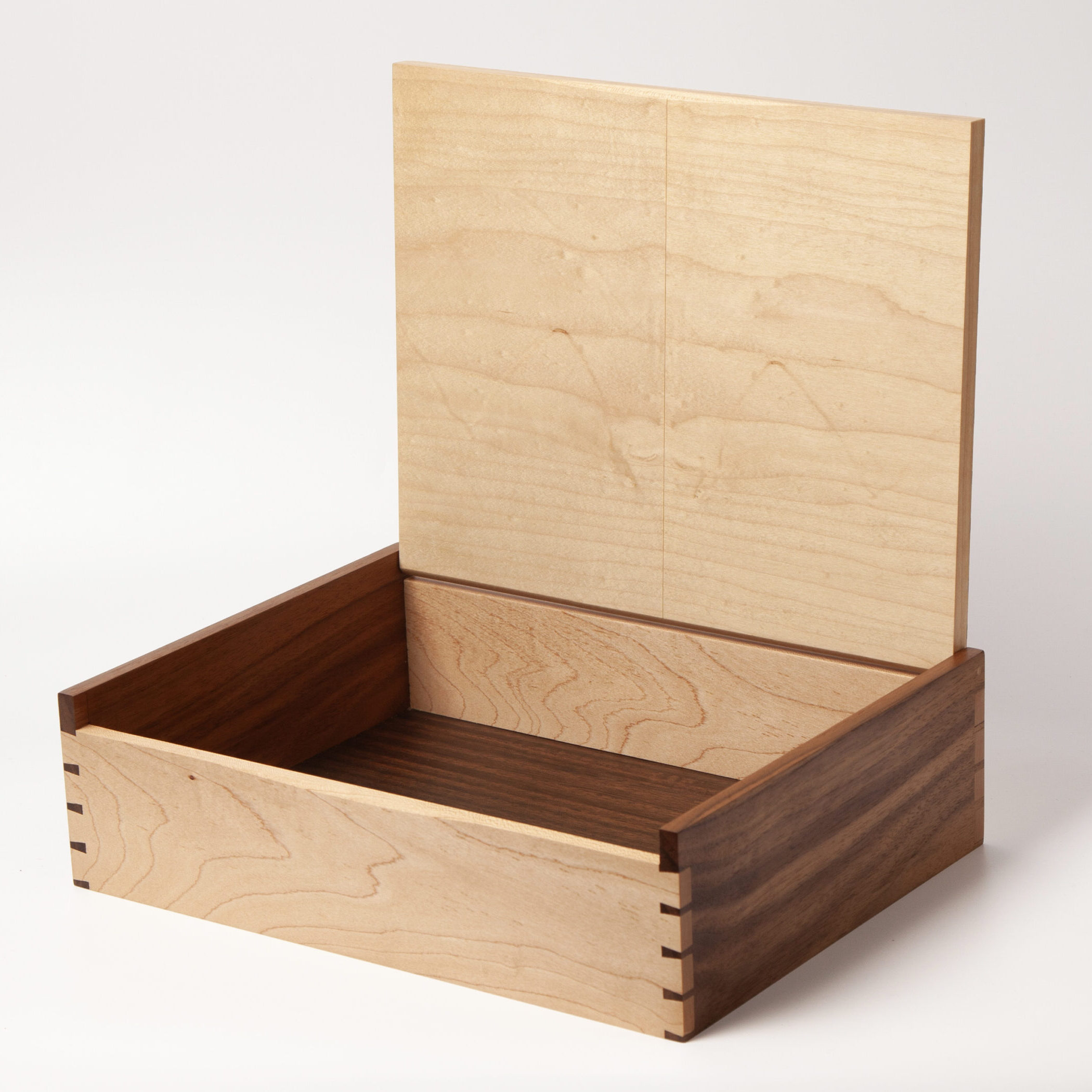 A solid oak record cabinet designed to subtly protect record players while allowing for storage below.