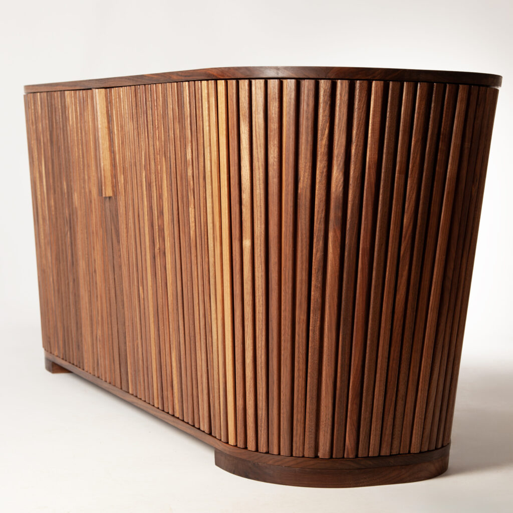 A Walnut Credenza with a unique angled tambour, allowing for a unique look.